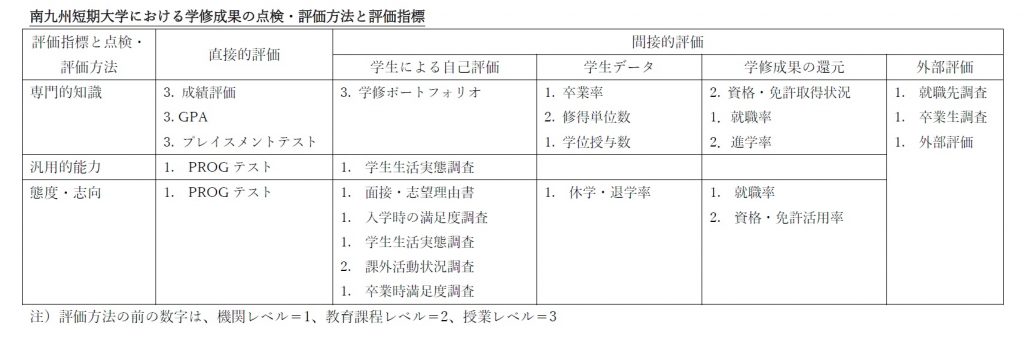 南九州大学短期大学部では、短期大学士課程教育の成果を可視化し、教育改善・進化に取り組むことを目的に、学生の学修成果を点検・評価します。学修成果の点検・評価にあたっては、本学の教育の理念・目標及び学科の3つの方針(ディプロマポリシー、カリキュラムポリシー、アドミッションポリシー)に基づき、短期大学(機関レベル)、学科・コース(教育課程レベル)、科目(授業レベル)の3つのレベルにおいて、直接的かつ間接的評価指標の下、多面的に行います。
