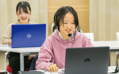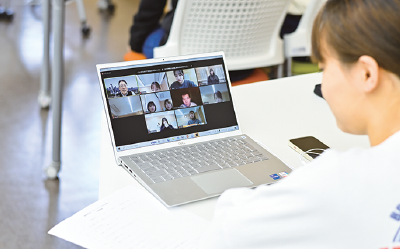 2022年度からはコースの全員がオンラインでのグ口ーバル文化交流に参加。普段の授業で、海外の大学生と毎週オンラインで結ぶことにより、英語を実践的に使う機会が増え、学習意欲が高まります。