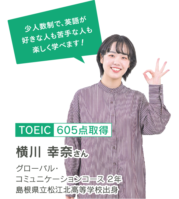 いつも手厚くサポートしてくださる先生方のもとで、たくさんの学びを得た2年間でした。「使える英語」「話せる英語」が身に付き、ZOOMで海外の方と話す授業をきっかけに自信も付きました。就職活動では何度も面接練習を繰り返すことで、希望の会社に内定をいただけました。春からは新しい環境となりますが、できないことから逃げず、自分自身と向き合える社会人になりたいと思います。