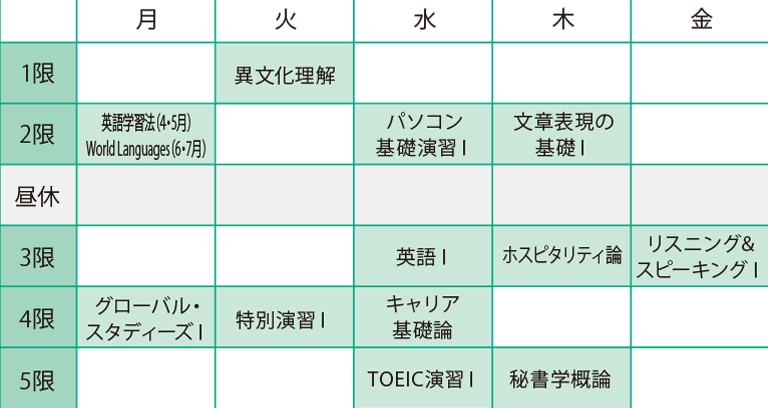 学科必修科目 ●文章表現の基礎Ⅰ ●秘書学概論 ●Basic English ●パソコン基礎演習Ⅰ ●ホスピタリティ論 ●特別演習Ⅰ