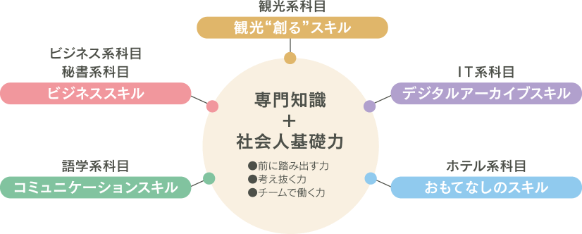 | コース必修科目 | ●観光ビジネス実務総論 ●プレゼンテーション概論 ●観光地理Ⅰ ●ホスピタリティ・マネジメント |