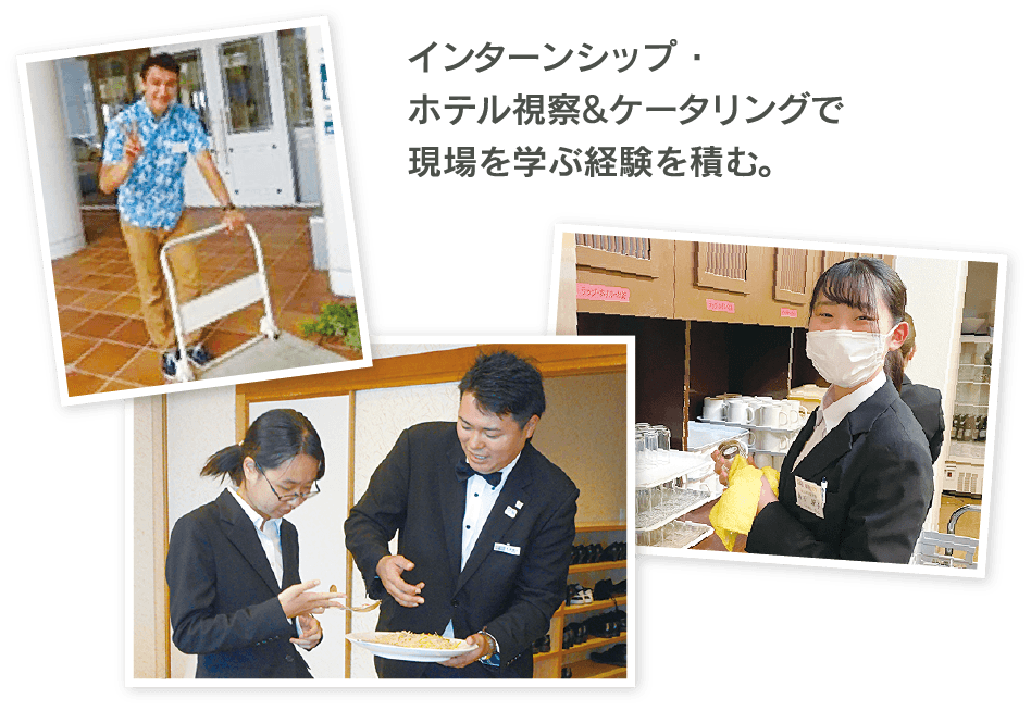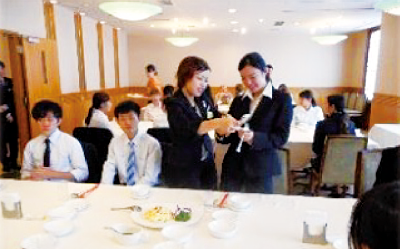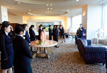 ホテル業界で働く職業人としての専門知識を学び、地域社会に貢献しうる有為な人材養成を目的とした授業です。上記の写真は「ホテル視察&ケータリング実習」の1コマです。