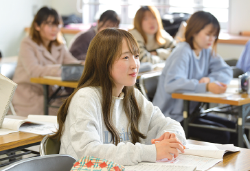 | 共通教育科目 | ●哲学 ●日本史 ●憲法 ●法律学 ●統計学 ●社会学 ●心理学 ●人間形成論 ●体育実技Ⅰ・Ⅱ ●日本文化(茶道Ⅰ) ●国外研修 Ⅱ |