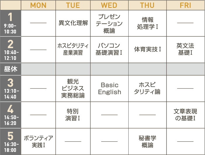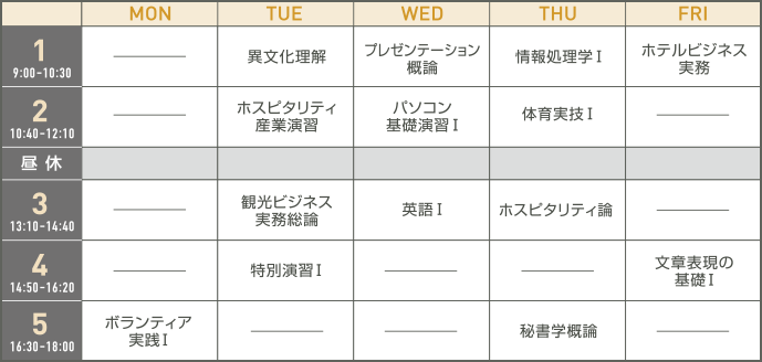 | 学科必修科目 | ●文章表現の基礎Ⅰ ●秘書学概論 ●Basic English ●パソコン基礎演習 ●ホスピタリティ論 ●特別演習Ⅰ |
