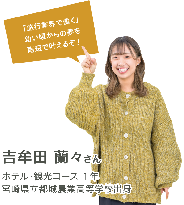 韓国が好きで、「旅行関係の仕事に就いて国際交流がしたい」と思い、南短に入学しました。南短の魅力は、専門分野を楽しく学べることです。2年次で学ぶ韓国語もとても楽しみにしています!旅程管理主任者の資格取得では、研修先の仙台でグルメや観光も満喫でき、良い思い出になりました。また、インターンシップでは、チームワークの大切さや責任感を培うこともできました。これからも多くを学び、将来はグランドスタッフとして活躍したいと考えています。