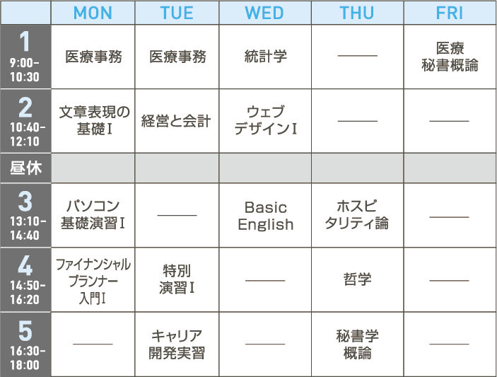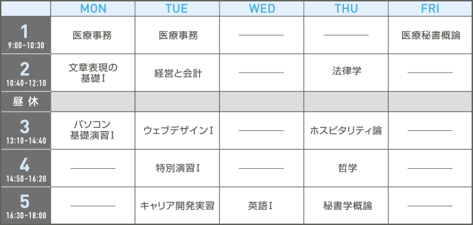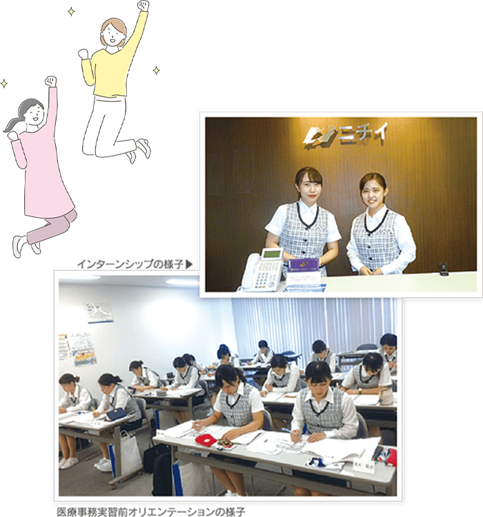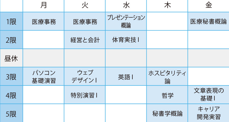 | コース必修科目 | ●医療事務 ●医療秘書概論 ●医療秘書実務 ●経営と会計 ●簿記原理 |