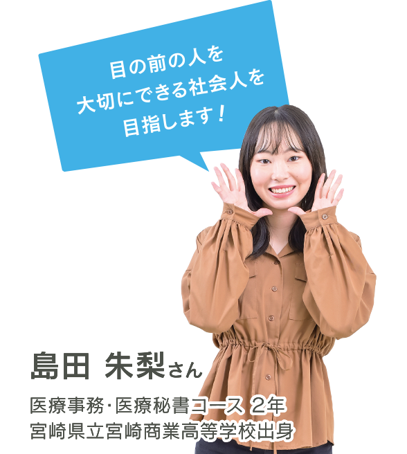 私の将来の夢は、ドクターズクラークとして医療の現場を支えることです。南短では、医療事務に加えて心理学や秘書学も学び、物事のとらえ方や考え方が変わりました。現在、秘書検定3級を取得し、卒業までにはメディカルクラークや簿記など、多くの資格取得を目指しています。また、オープンキャンパスのサポートでは来場者の方に楽しんでもらえるようにと、積極的に話すこともできるようになりました!目標・夢を達成するため、さらに成長していきたいです。
