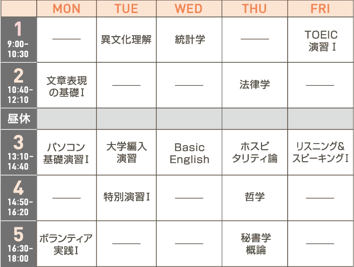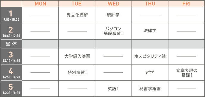 | 学科必修科目 | ●文章表現の基礎Ⅰ ●秘書学概論 ●Basic English ●パソコン基礎演習Ⅰ ●ホスピタリティ論 ●特別演習Ⅰ |