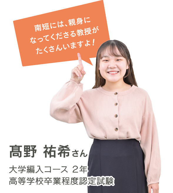 私の将来の夢は、国際公務員として貧困地域に暮らす人々の生活の改善に取り組むことです。今は、TOEIC800点を目指すと同時に、さらなる成長に向けて興味や学びを広げています。南短の大学編入コースで2年間を過ごしたことで、自分と真摯に向き合うことができ、今後の人生や目標について明確にすることができました!これから南短を目指す方にも、きれいなキャンパスで自分を成長させながら、楽しい学生生活を送って欲しいと思います。