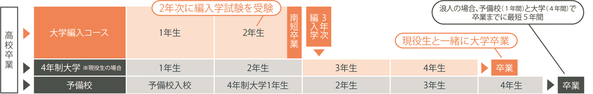 編入学とは、短大等を卒業した学生が4年制大学の2年次あるいは3年次に編入学する制度です。この制度は情報量が少なく、あまり知られていません。編入学試験では、志望する4年制大学の1、2年次で学習する専門科目の内容を理解しているかどうかが問われます。