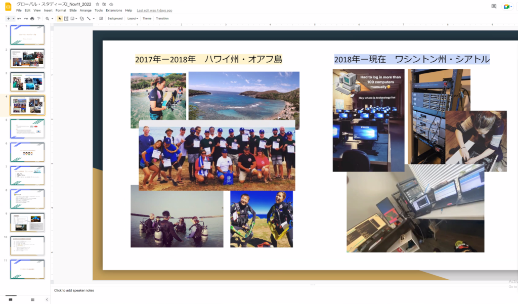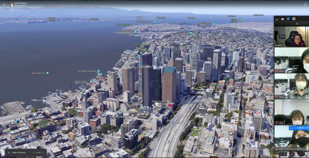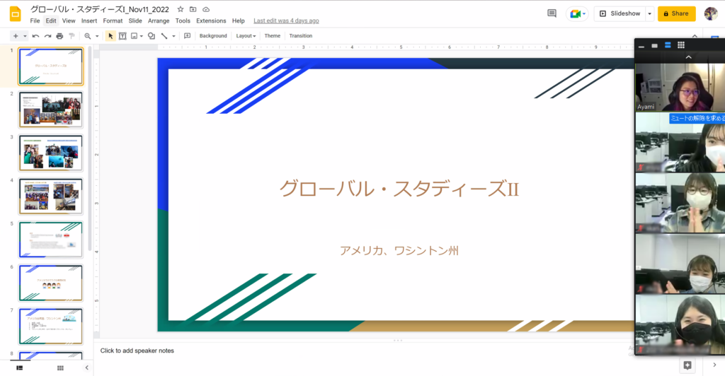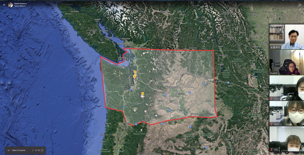 受講生によるプレゼンは12月から始まりますが、11月11日(金)の授業では、本学の旧留学コースを2012年に卒業した中野紋実さん(宮崎北高校出身、2010年秋から半年間アメリカでの単位認定留学に参加)から、Zoomを利用して、アメリカ・ワシントン州についてのお話を伺いました。