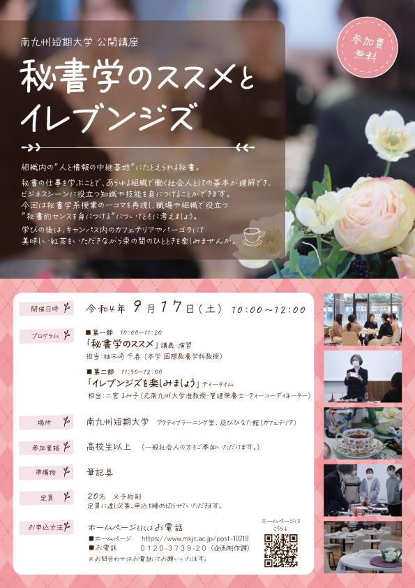 9月17日(土)に南九州短期大学にて開催を予定しておりました公開講座「秘書学のススメとイレブンジズ」ですが、この度の台風接近の予報を受け、受講される皆様の安全を考慮した結果、延期とさせて頂きます