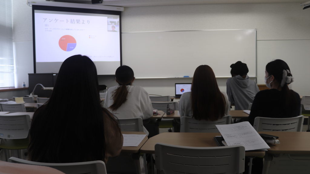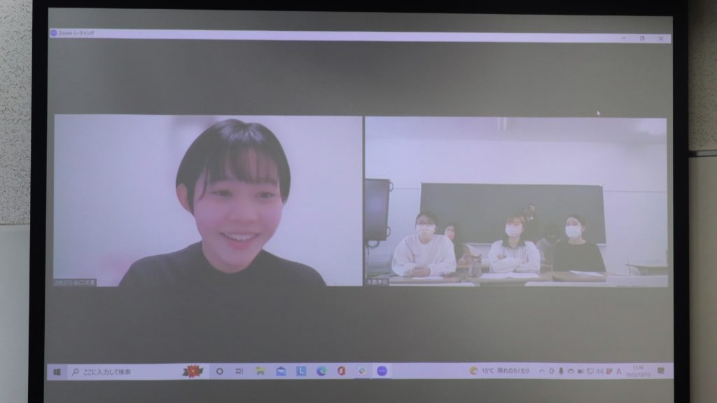 グローバル・コミュニケーションコース2年次の必修科目である「グローバル・プロジェクトⅡ」(担当:水島孝司先生)の12月12日(月)の授業では、谷口成美さんにZoomを利用してプレゼンしていただきました。