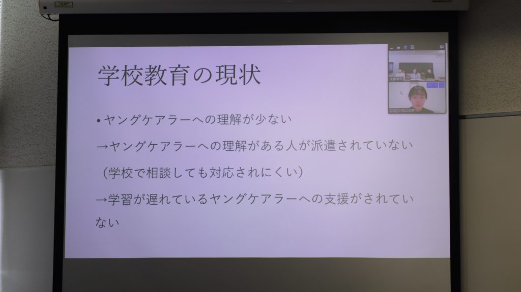 12日の授業は、短大在学中に谷口さんのアカデミック・アドバイザーを務めた水島先生が、彼女から学生ゼミナールで発表したことを聞いて実現したものです。「ヤングケアラー」の問題は、今年度前期の「グローバル・プロジェクトⅠ」でも触れたことのあるテーマで、SDGsにも関連します。