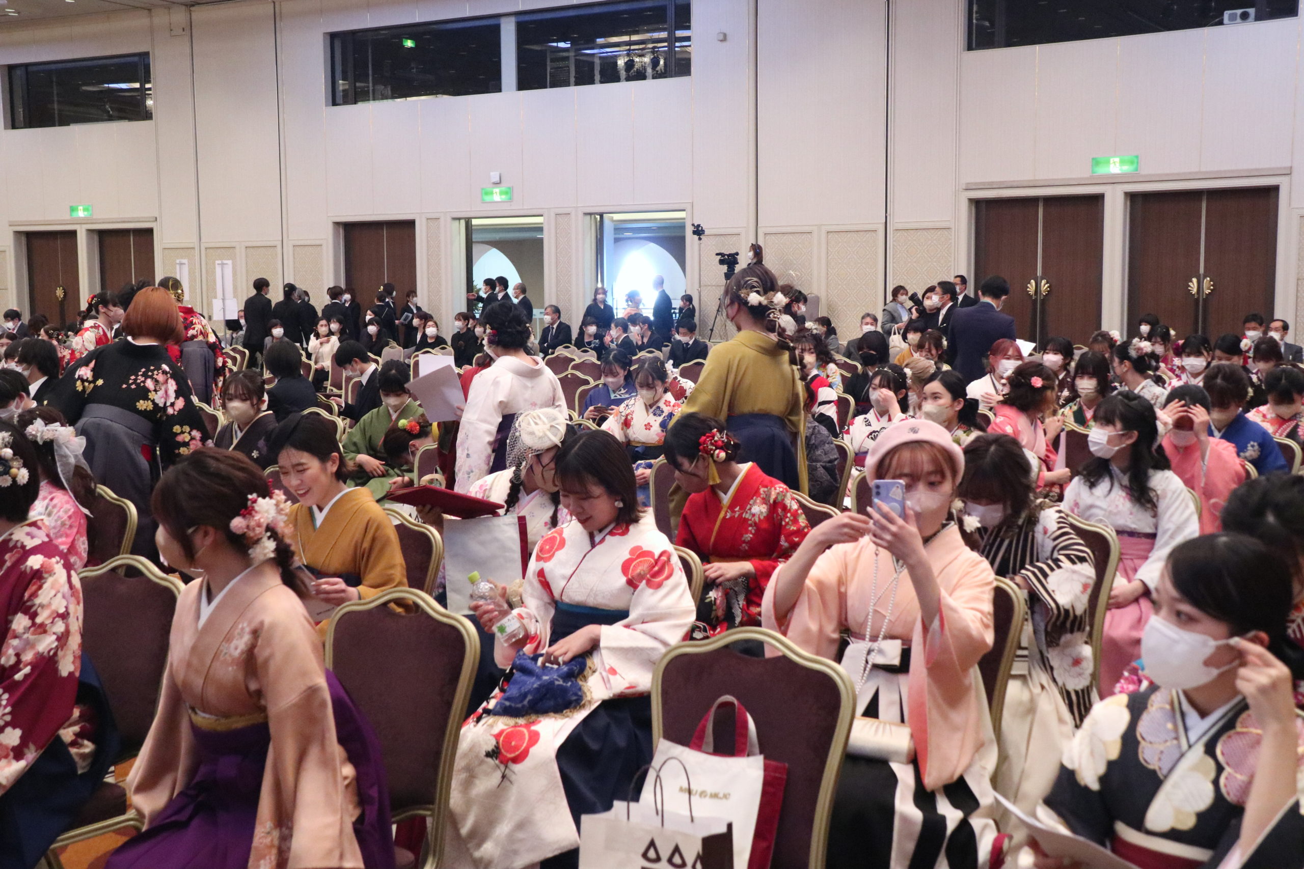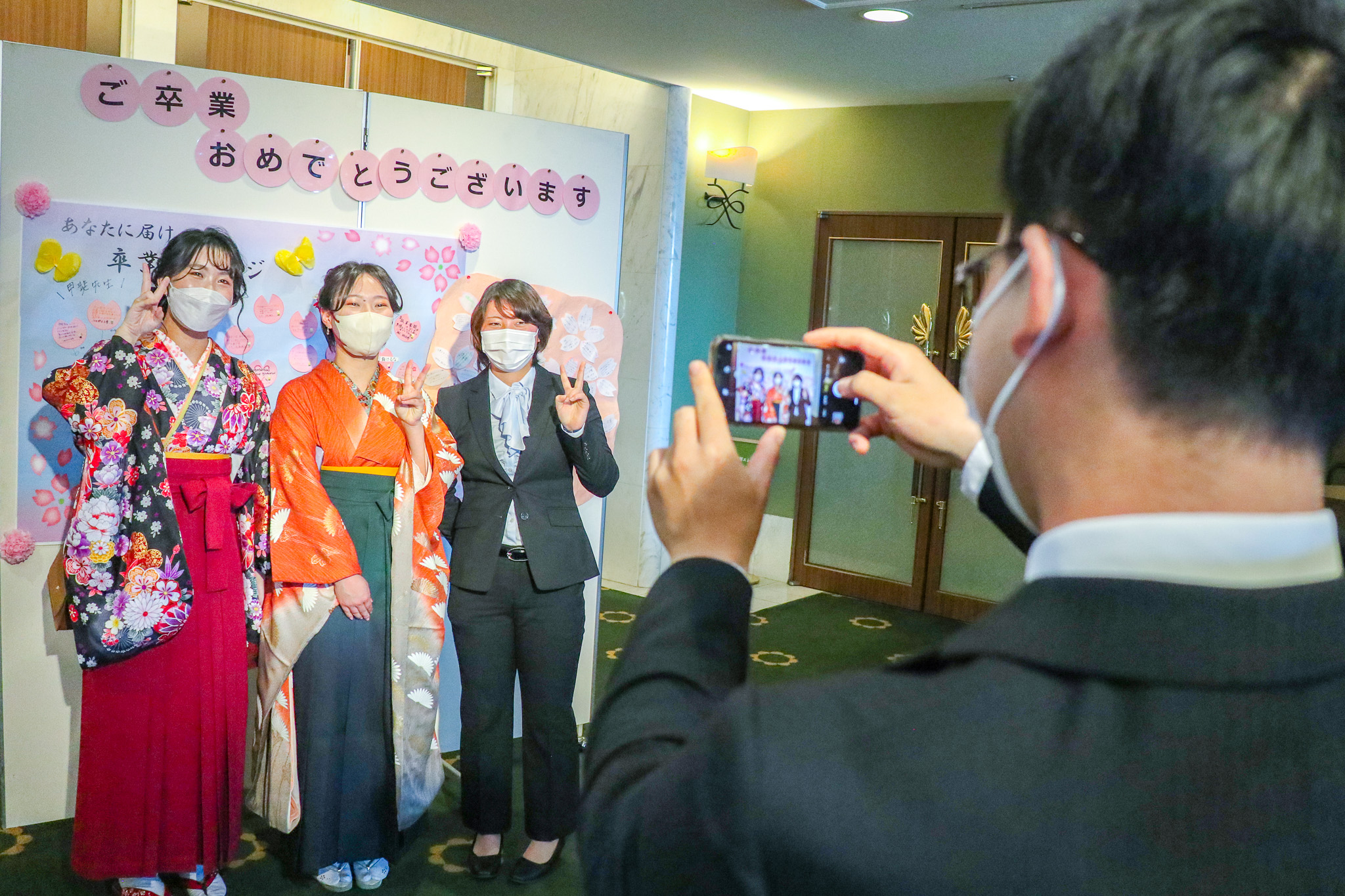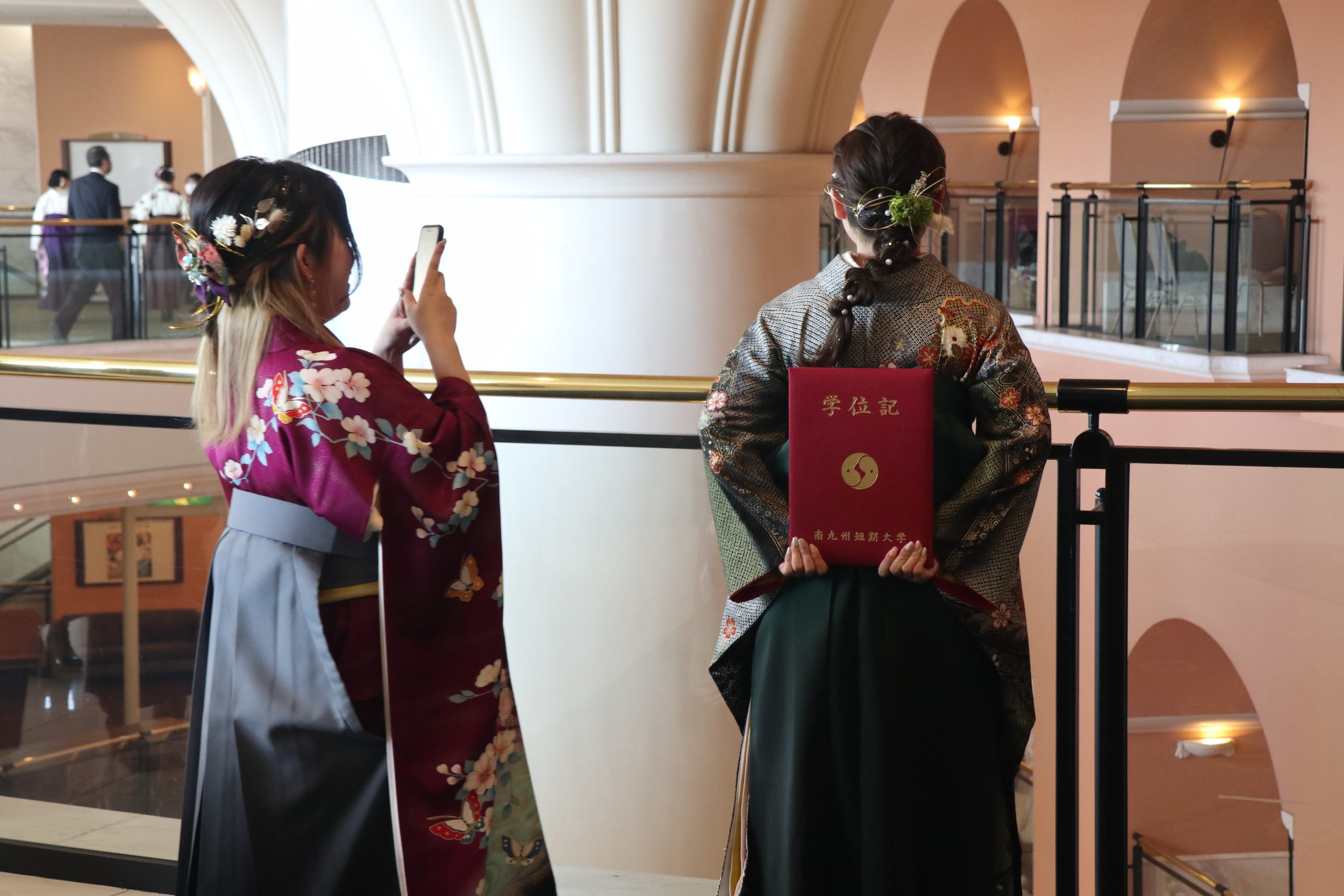 2023年3月14日(火)、宮崎観光ホテル 東館 3階「光耀」にて南九州大学・短期大学・大学院合同の令和4年度卒業式および修了式が執り行われました。新型コロナウイルスの感染状況を踏まえ、本式典の出席者は卒業生本人のみに限定し、同時に保護者の方々へ向けてライブ動画の配信を行いました。