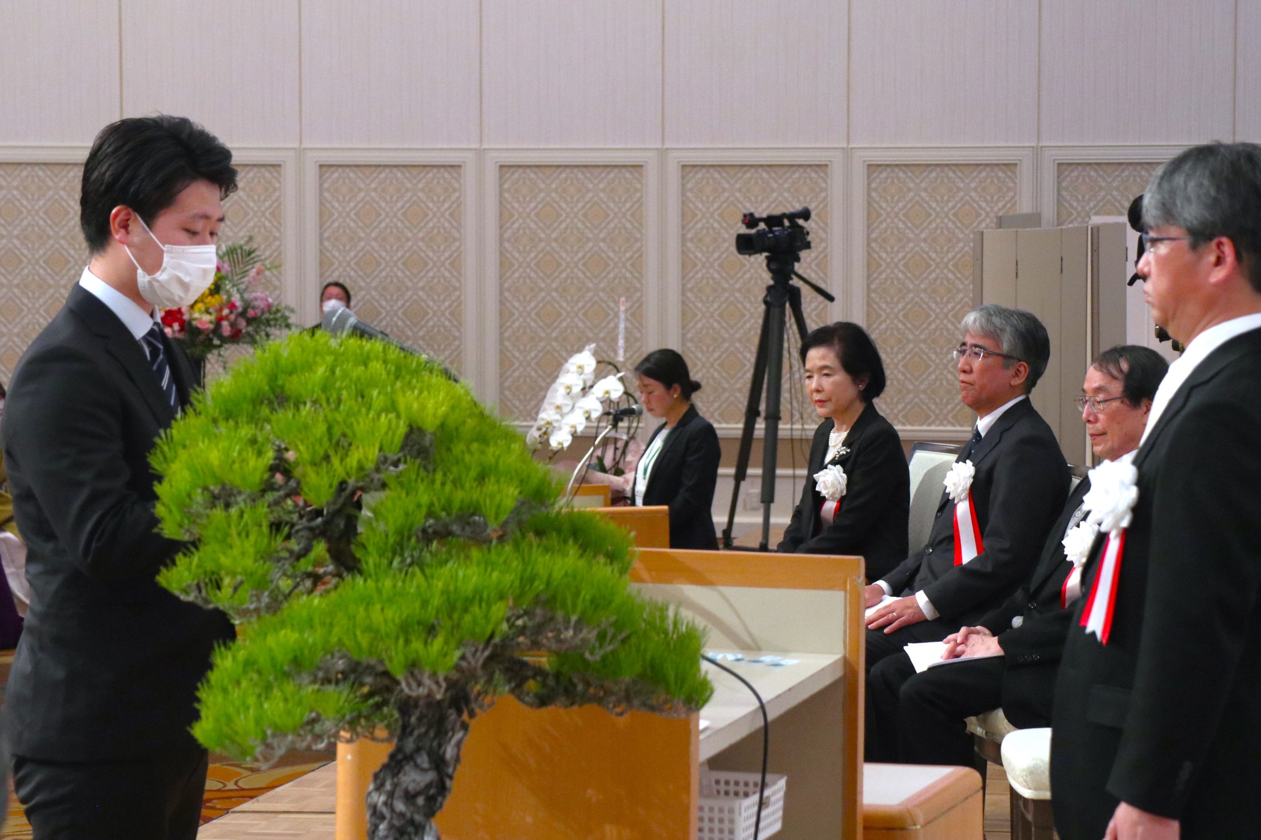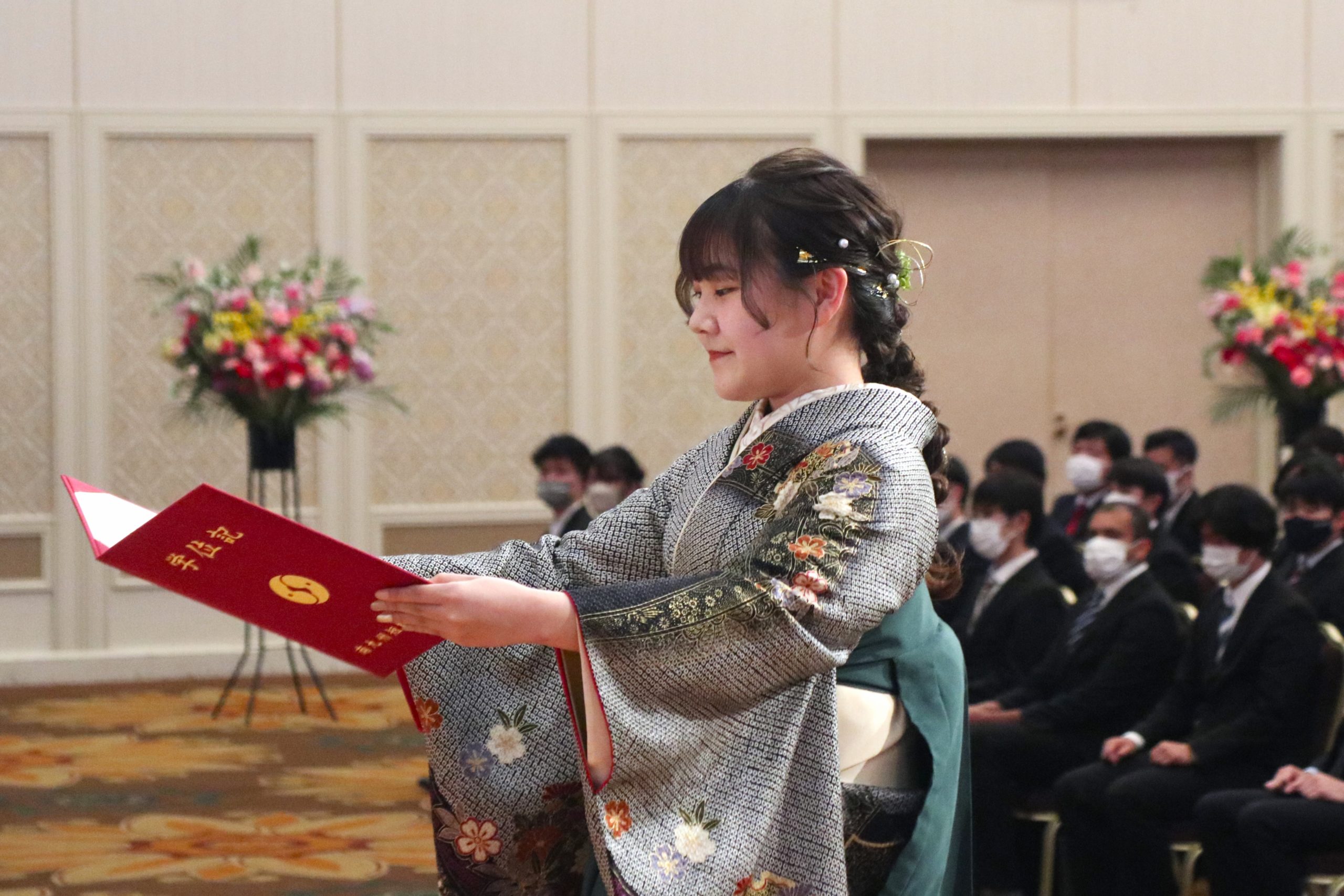 続いて、都城副市長による来賓祝辞、来賓紹介、大学・短大でそれぞれ功績のあった卒業生の学園表彰、特別表彰が行われました。 その後、大学、大学院、短期大学の総代よりそれぞれ答辞が述べられ、令和4年度の卒業式が修了しました。