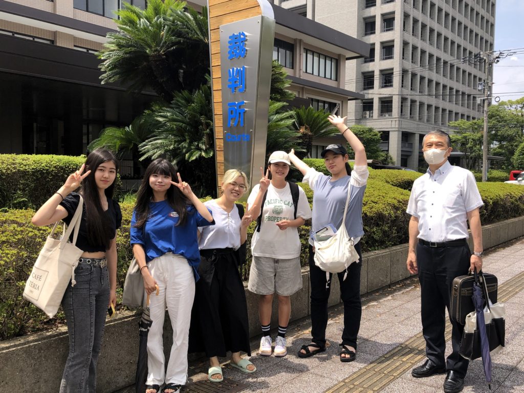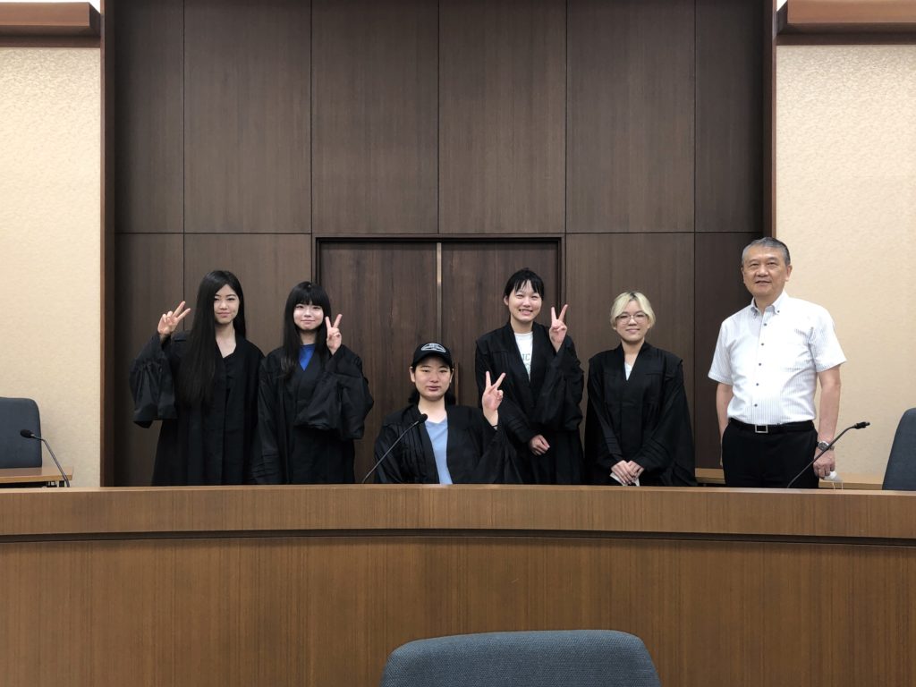 7月26日、法律学の授業の一環として、宮崎地方裁判所に裁判傍聴に行きました。実際の裁判を傍聴した後は、職員による裁判員裁判の説明を受け、また、法服をまとい裁判官の気分を味わいました。