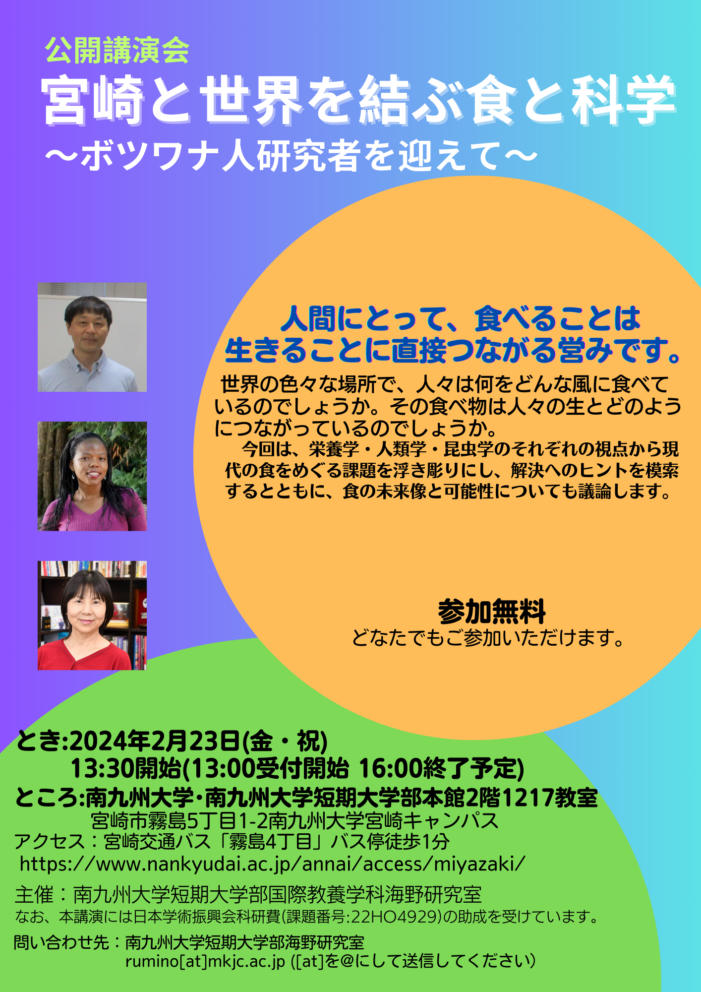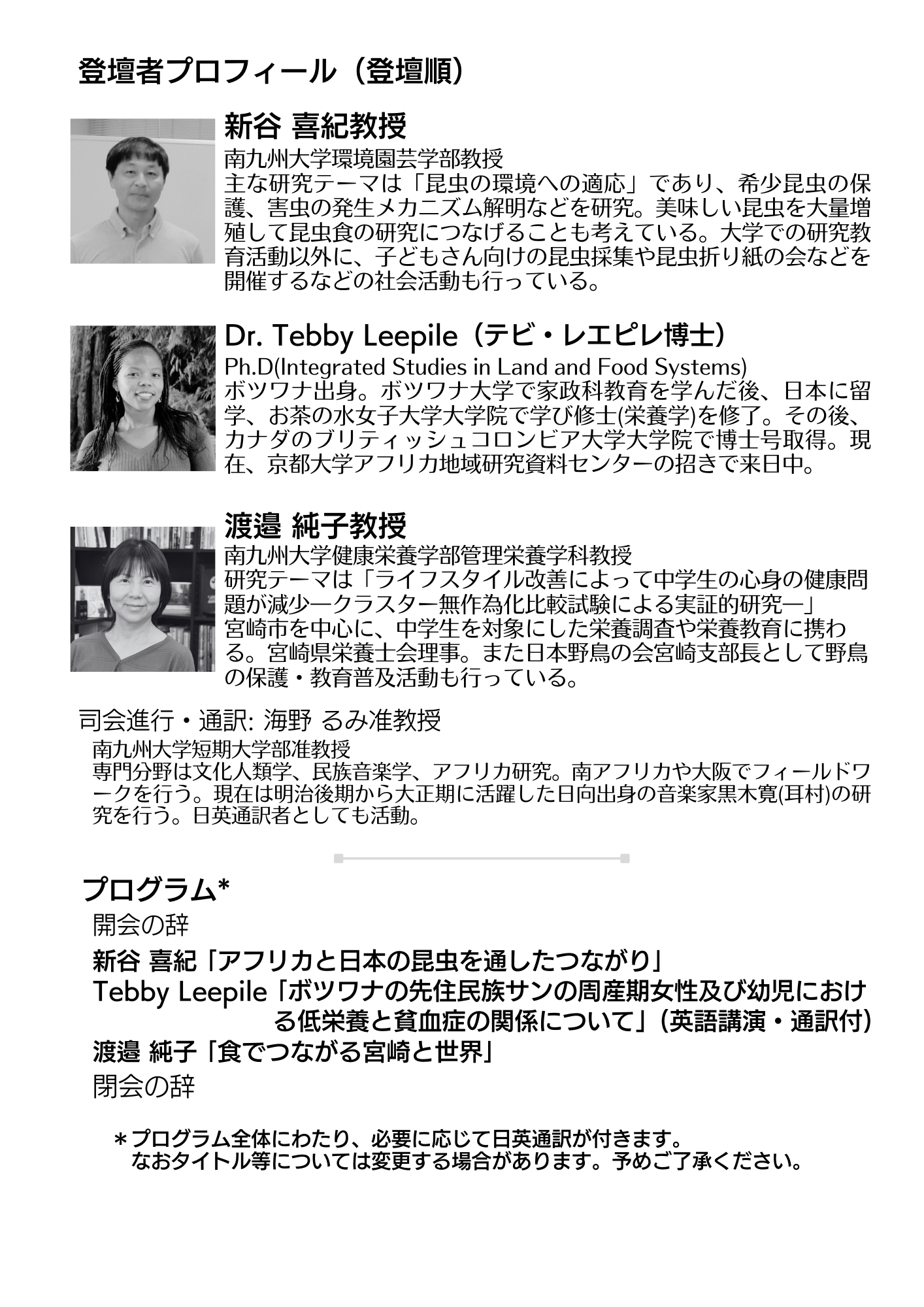 今回は、ボツワナ人研究者テビ・レエピレ博士を迎え、本学の渡邉純子教授、新谷喜紀教授と共に、栄養学・人類学・昆虫学の視点から、現代の食をめぐる課題に迫り、解決へのヒントを模索します。さらに食の未来像や可能性についても考えます。