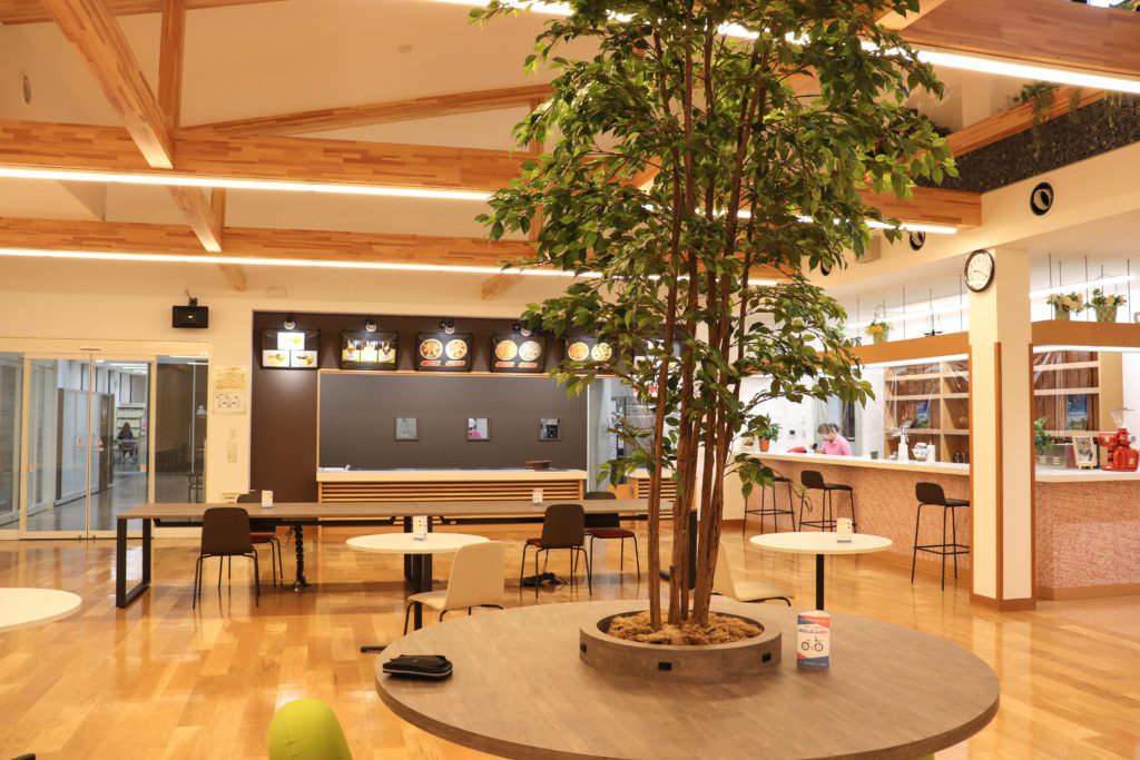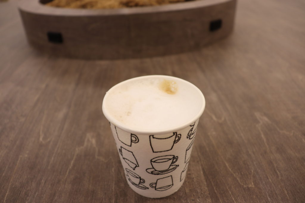 おいしい泡たっぷりのホットカフェラテは160円。1杯1杯、エスプレッソマシーンで丁寧に淹れています。授業の空き時間などに、ぜひアンジュールひなた館へ足を運んでください。