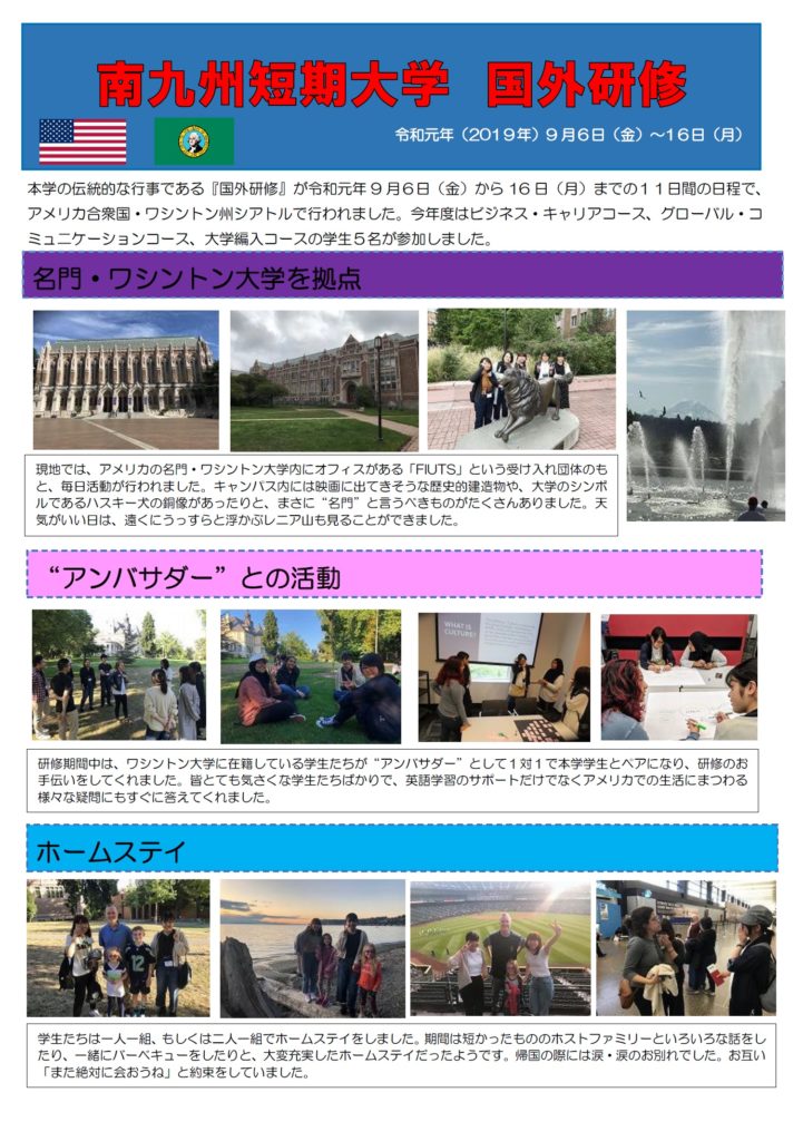 本学の伝統的な行事である「国外研修」が令和元年9月16日(月)までの11日間の日程で行いました。今年はアメリカ合衆国・ワシントン州シアトルで研修を実施し、5名の学生が参加しました。今年度の詳しい内容は、こちらをご覧ください↓↓↓。(下の画像をクリックすると拡大します。)
