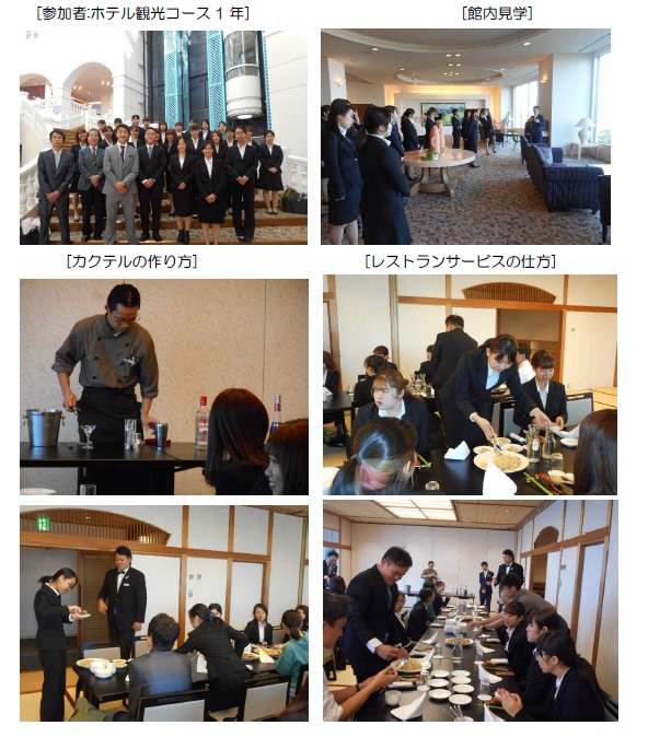 ホテル施設の見学・実際のサービス用具を使用してのレストランサービスのサービスの仕方・カクテルの作り方・等々を体感する授業です。担当スタッフの業務での様々なエピソードも聞けて充実した学修ができました。
