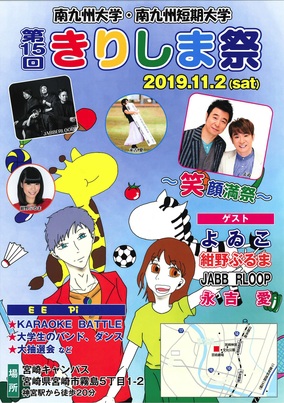 当日は、、南九州短期大学出身のシンガーソングライター永吉愛さんやクラブジャズ・バンド「JABBERLOOP」によるスペシャルライブ、沖縄エイサーや大学生バンドの演奏など実施されます。さらにスペシャルゲストにテレビなどで幅広く活躍中のお笑いコンビ「よいこ」によるお笑いライブもあります。