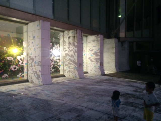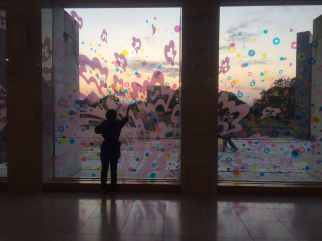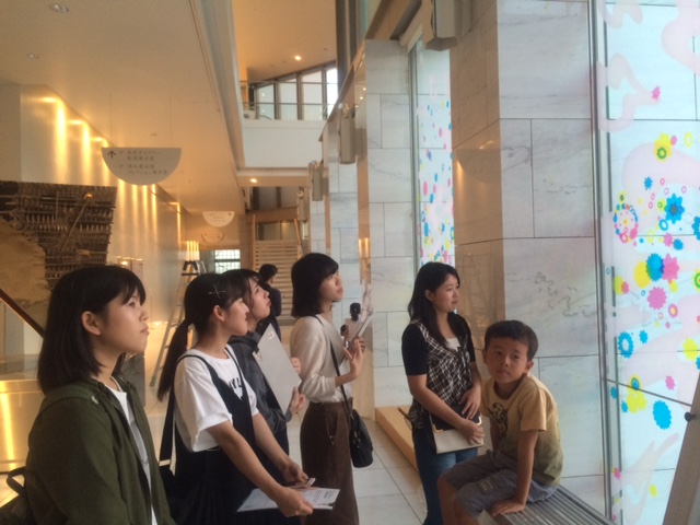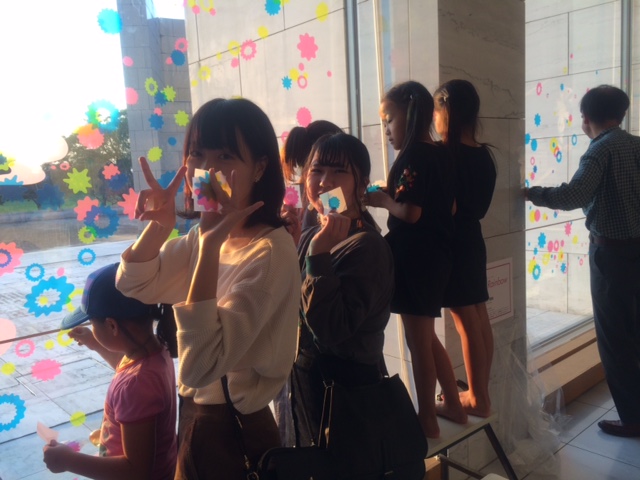 曽谷さんのトークに始まり、与えられたテーマ(ブロークンレインボー)に添って美術館の西側ガラス窓に色とりどりのシールを貼り参加者全員で作品を完成させました。日中の陽射しに照らされた色々と夕暮れ時の彩、またライトアップされた作品の色彩の変化にワクワクしました。貴重な体験でした。