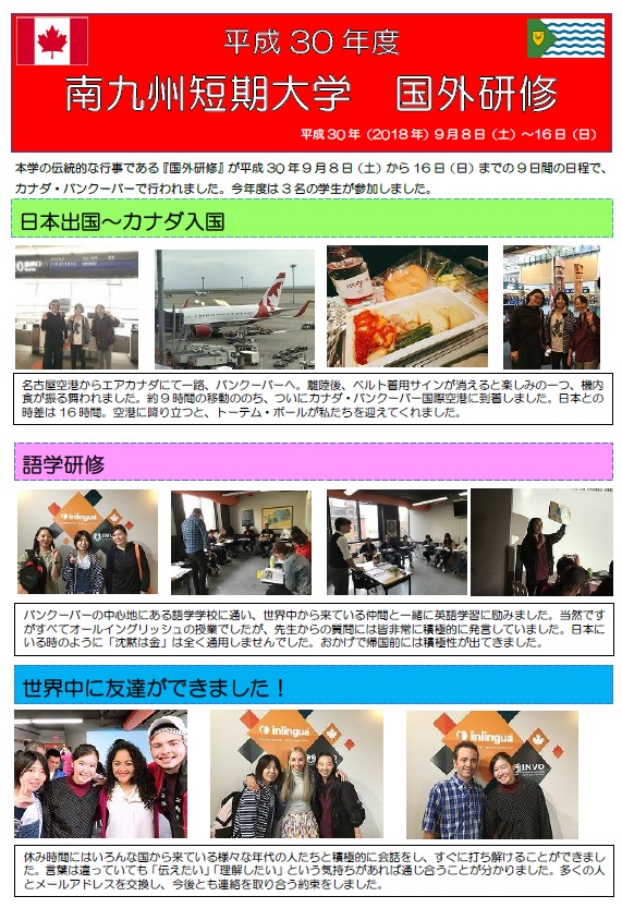 本学の伝統的な行事である「国外研修」が平成30年9月8日(土)から16日(日)までの9日間の日程で、カナダ・バンクーバーで行われました。今年度は3名の学生が参加しました。
