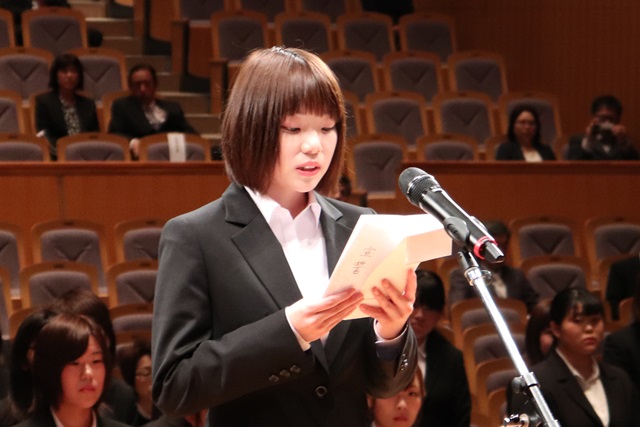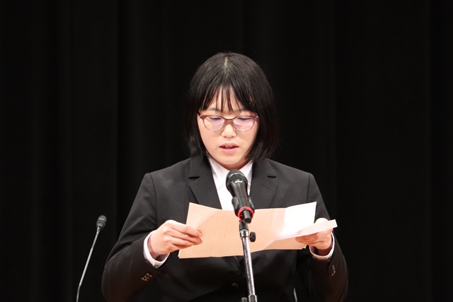 式の最後に、在学生を代表して国際教養学科2年 鎌田 かりんさんから新入生に向けて歓迎の挨拶がありました。