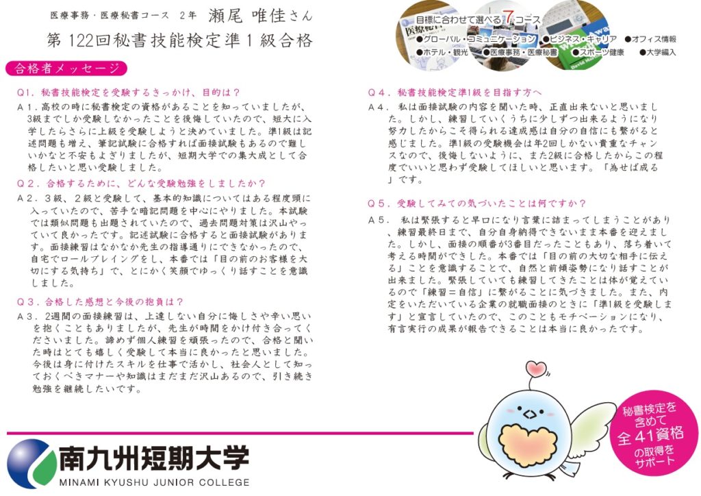 瀬尾唯佳さん(医療事務・医療秘書コースの2年)が「第122回秘書技能検定準1級」に合格いたしました。