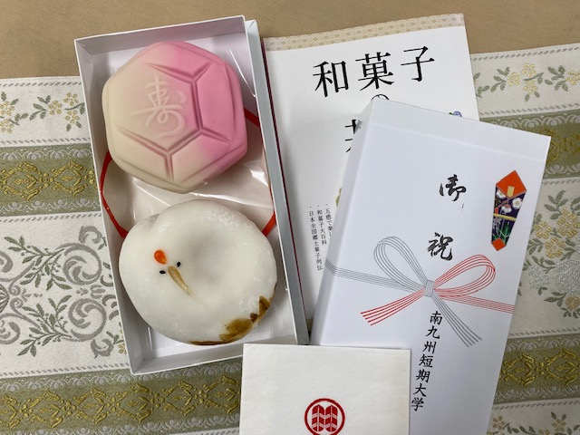 本講義最後(振り返りと総括)で受講者全員に「縁起菓子」が贈られました。鶴と亀が模られた和菓子で、卒業を控えた私たちの門出を祝う思いが込められたものでした。