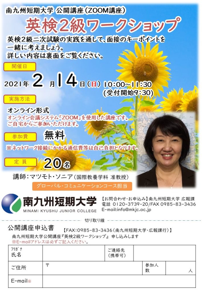 ※詳しい接続方法は、お申し込み後に南九州短期大学広報課(info@mkjc.ac.jp)よりお申し込みのEメールアドレス宛にご連絡致します。