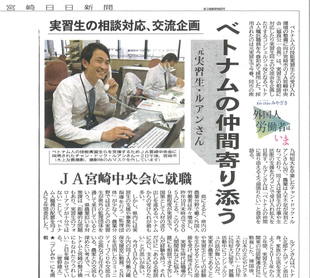 ルアンさんはベトナムのナムディン省出身で、日本の文化やビジネスを学ぶために本学で留学生として学び、今春に卒業しました。卒業後は宮崎市のJA宮崎へ就職し、農業における深刻な人手不足の解消のため、ベトナム人の技能実習生らの受け入れを支援するコンシェルジュ役として活躍されることを期待されています。記事:宮崎日日新聞社提供