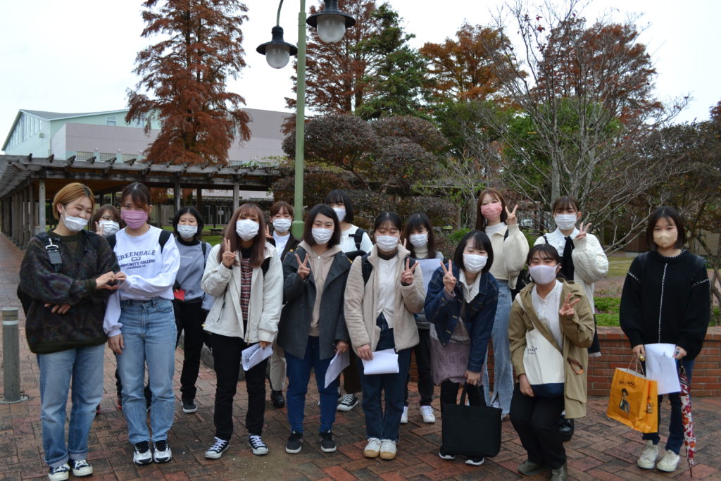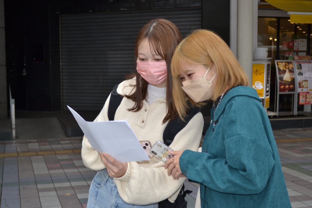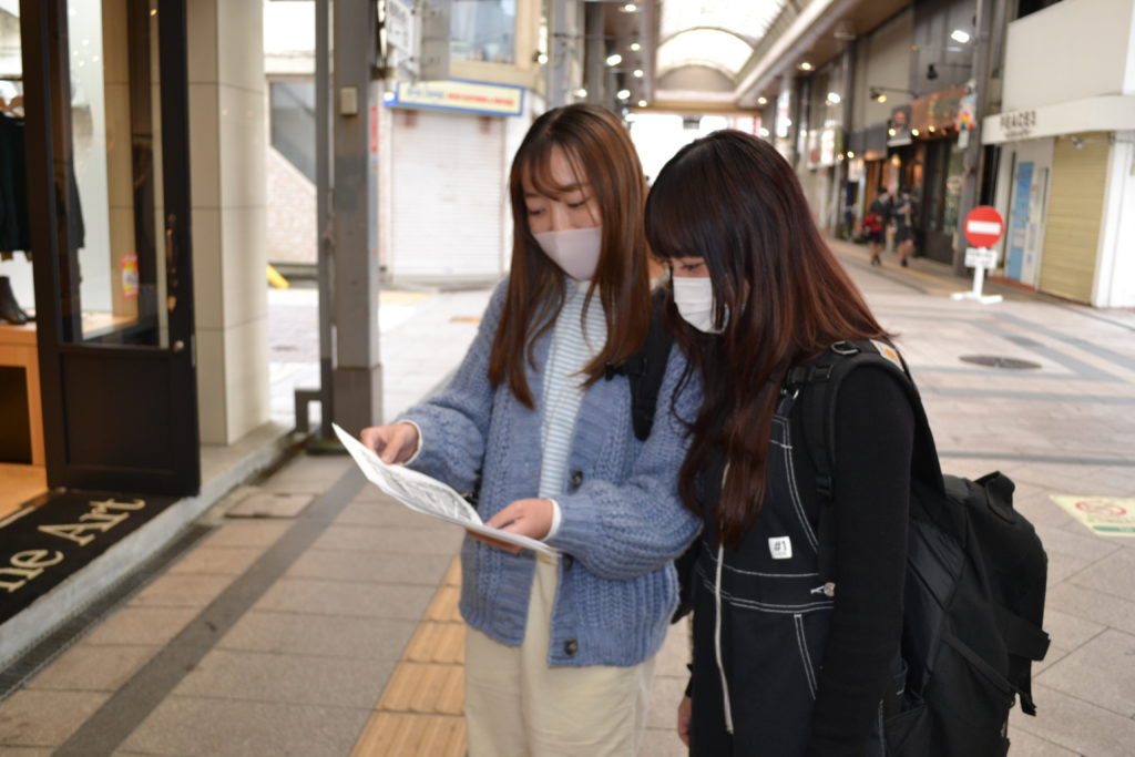 南九州短期大学国際教養学科ビジネス・キャリアコースの特別演習Ⅰ(秋谷公博准教授担当)で、Doまんなかモール加盟店舗の「おすすめのお店」と同地域の「おすすめスポット」の発掘を目的としたフィールドワークを2021年11月30日(火)に実施しました。学生も楽しみながらおすすめスポット等を調査していました。