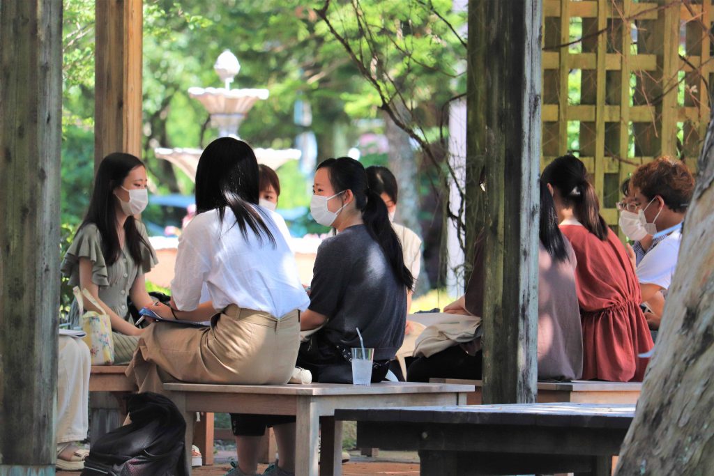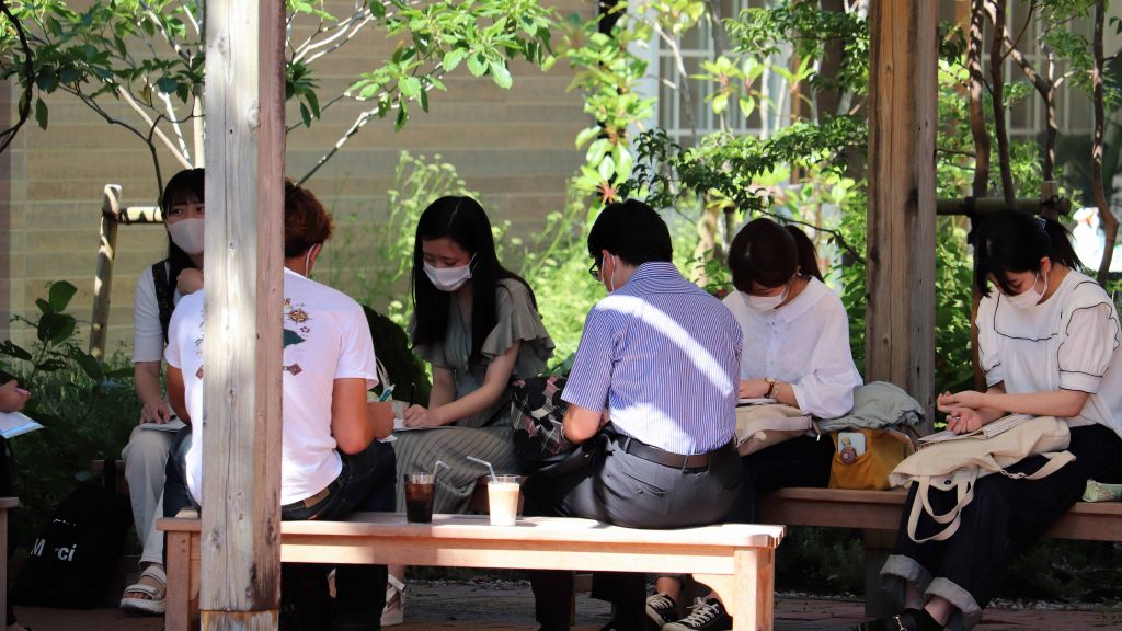 その中庭を囲む回廊にならぶベンチで、何やら集まって楽しそうに話をしている学生たちを発見。